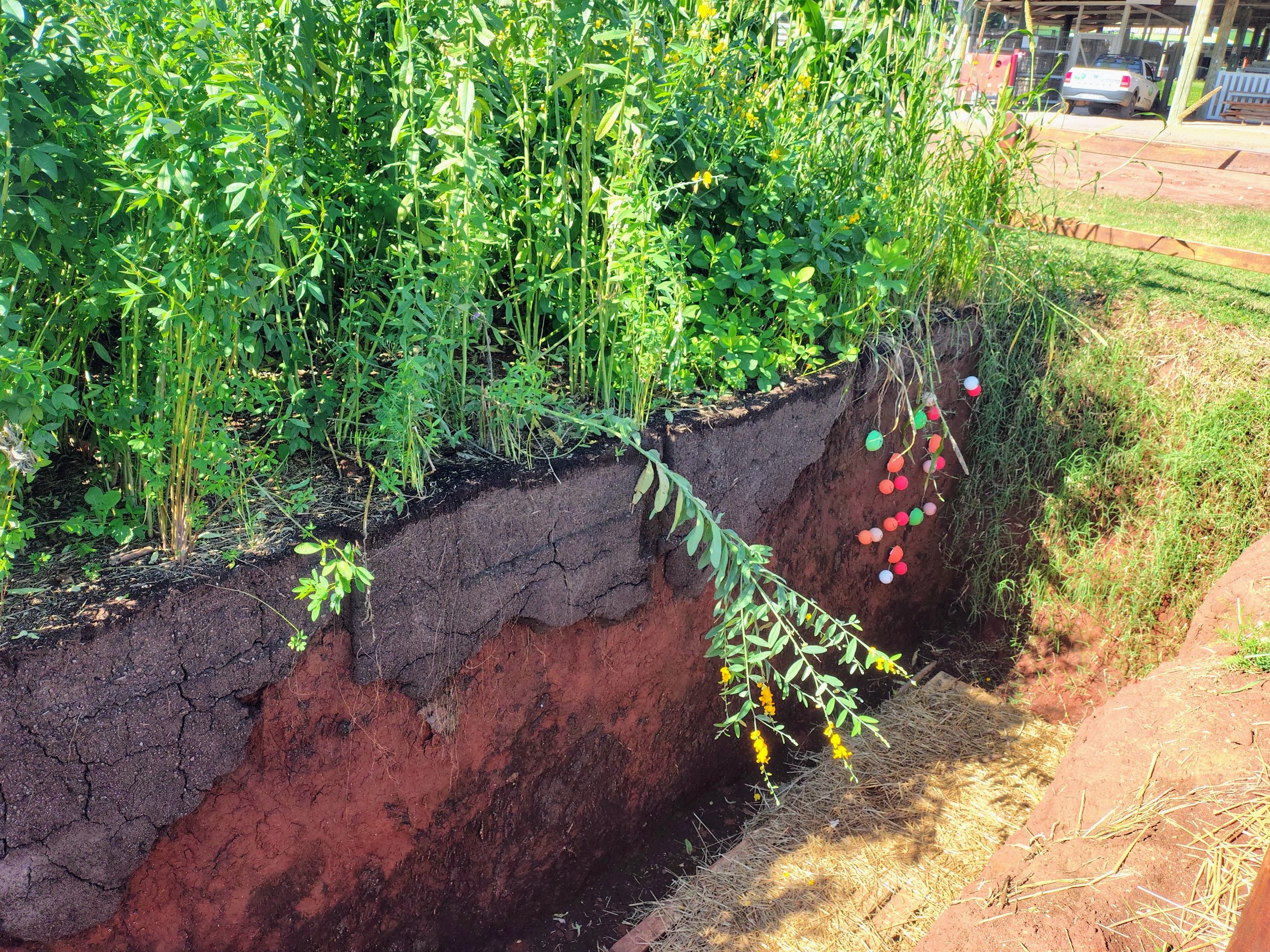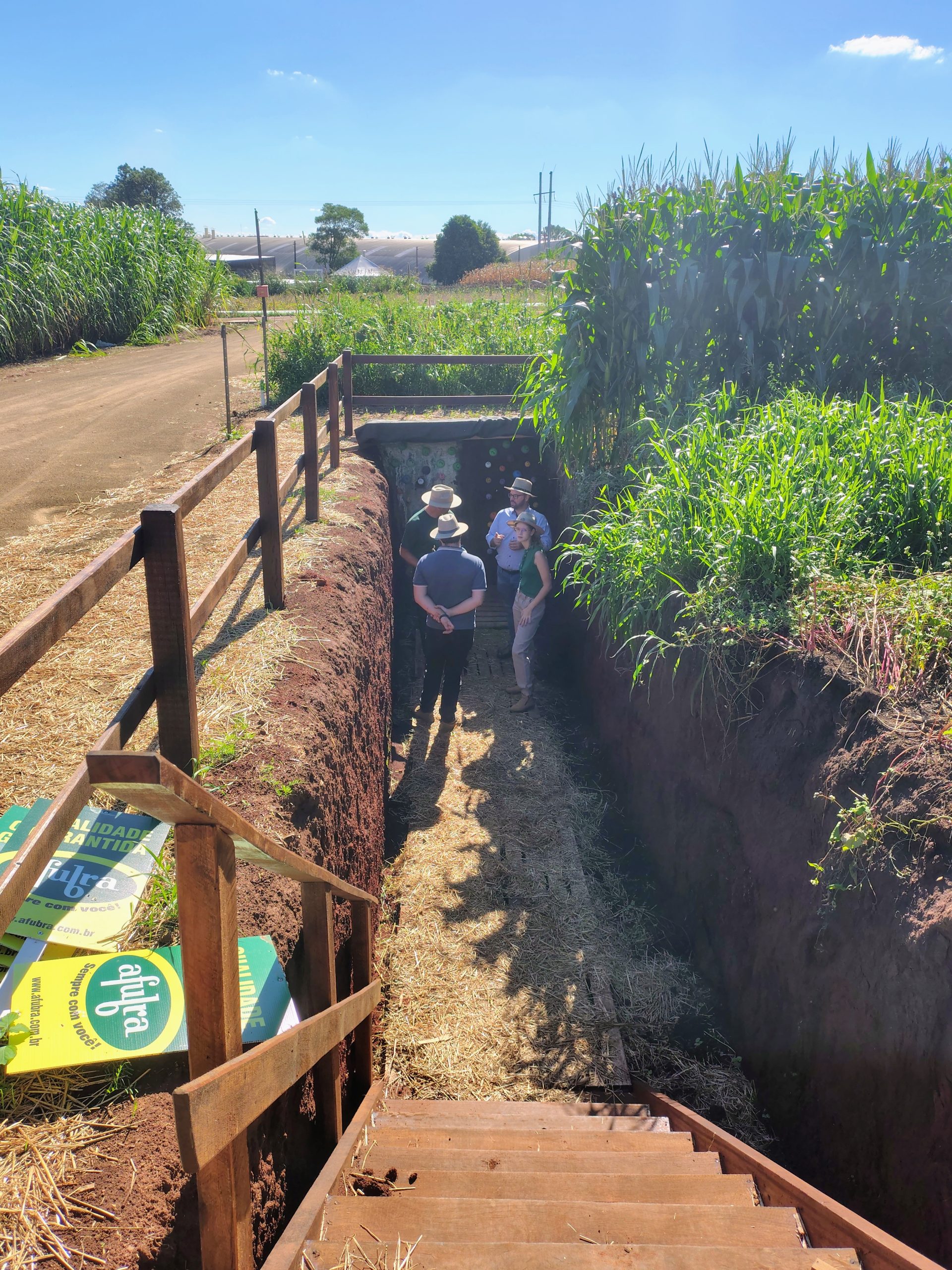 Através de uma trincheira aberta, foi possível observar como as raízes atingem profundidades impressionantes, favorecendo o desenvolvimento das plantas. A apresentação também destacou exemplos da movimentação de macro e micronutrientes no solo, conforme seu equilíbrio e correções.